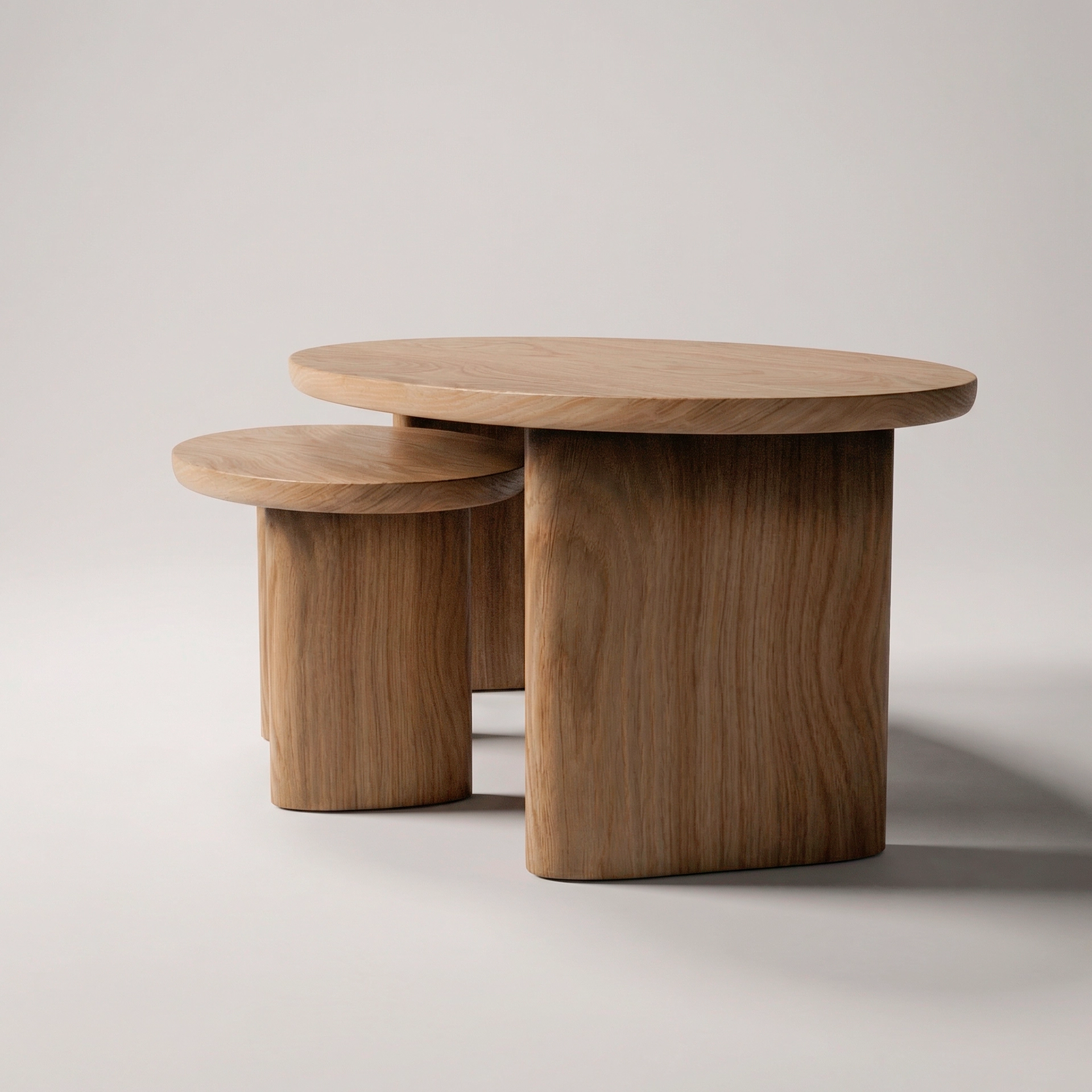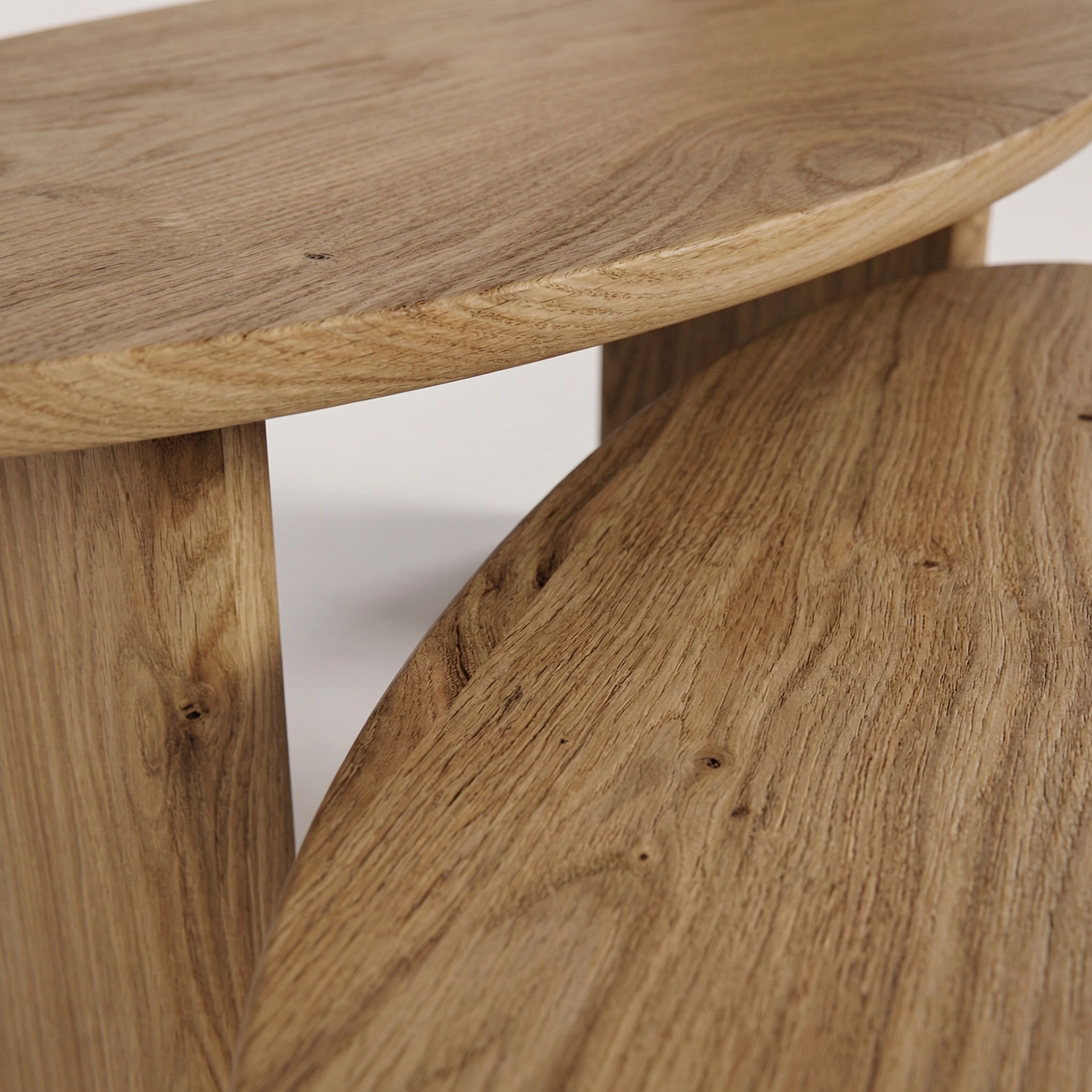 Diseño: Conjunto de dos mesas de silueta ovalada pensadas para solaparse, creando volúmenes dinámicos y adaptables al espacio.